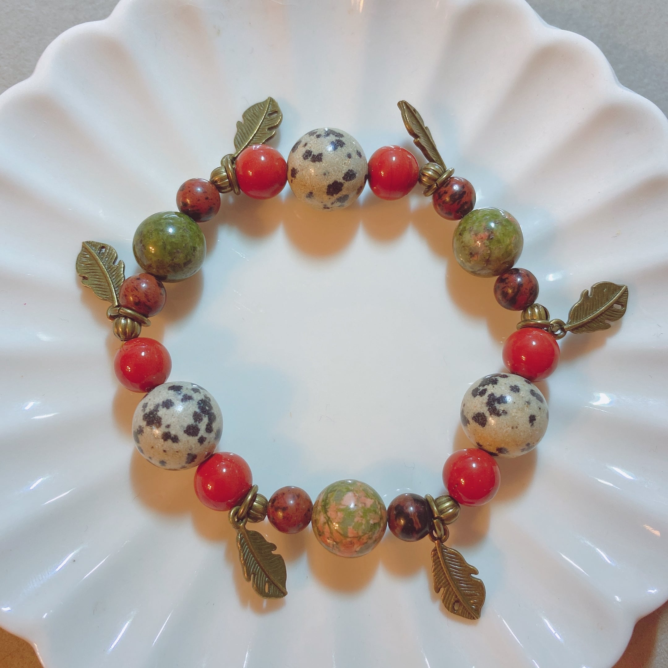 15.5cm【フェザーチャームのネイティブブレスレット】ダルメシアンジャスパー・ユナカイト・レッドジャスパー・マホガニーオブシディアン・瑪瑙・金古美・アンティークゴールド・浄化済み