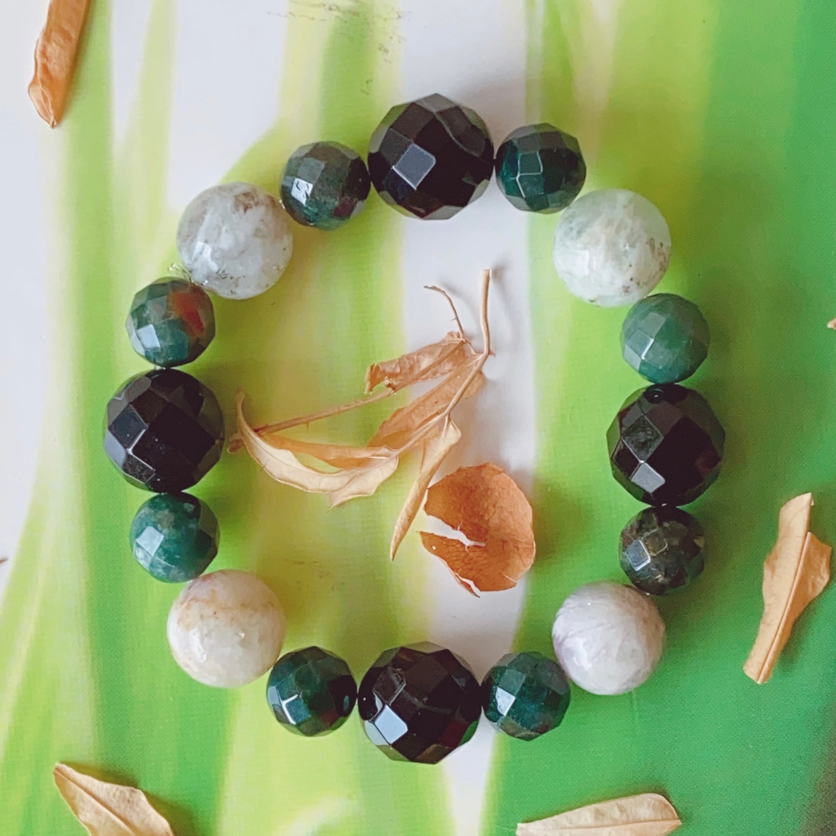 16cm【原点に戻る】ストライプオニキス・フェザーインフローライト・インドメノウ・天然石・パワーストーン・ヒーリングストーン・ブレスレット・曼荼羅・浄化済み