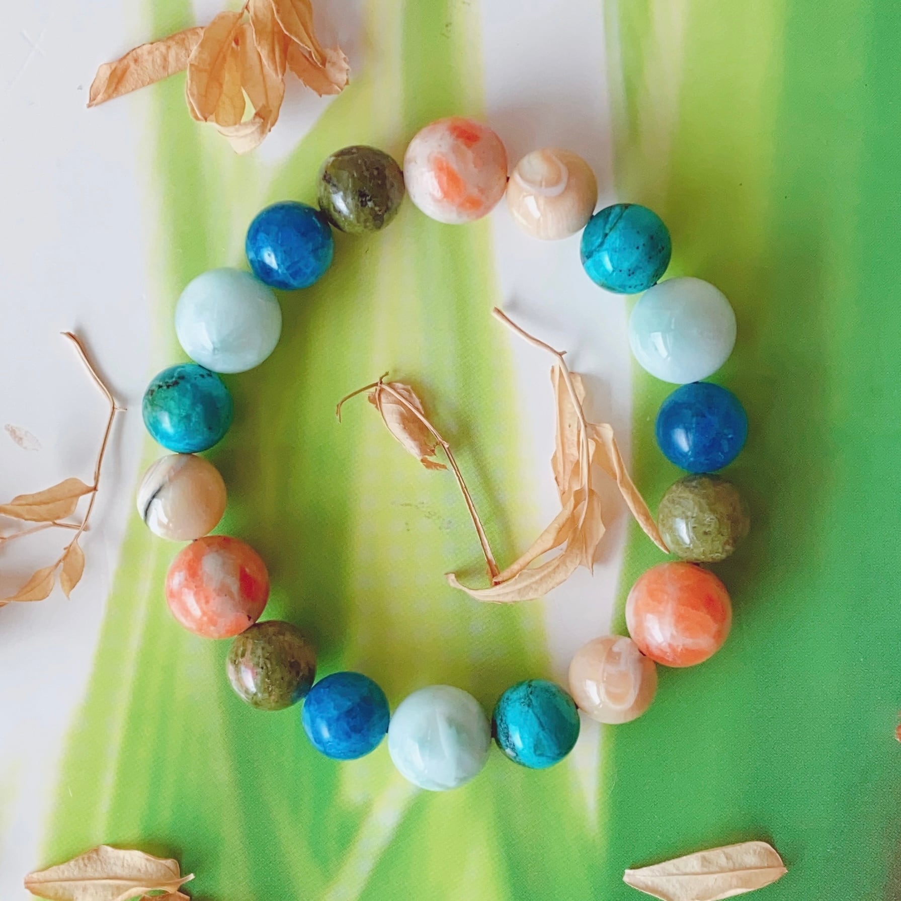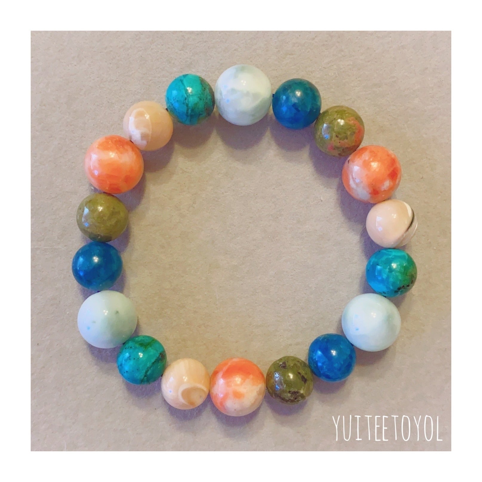 17cm【ピーターパン】6月誕生石・マザーオブパール・南アフリカ産クリソコラ・ペルー産セラフィナイト・オレンジカルサイト・デュモルチェライト・天然石・パワーストーン・ヒーリングストーン・ブレスレット・曼荼羅・浄化済み