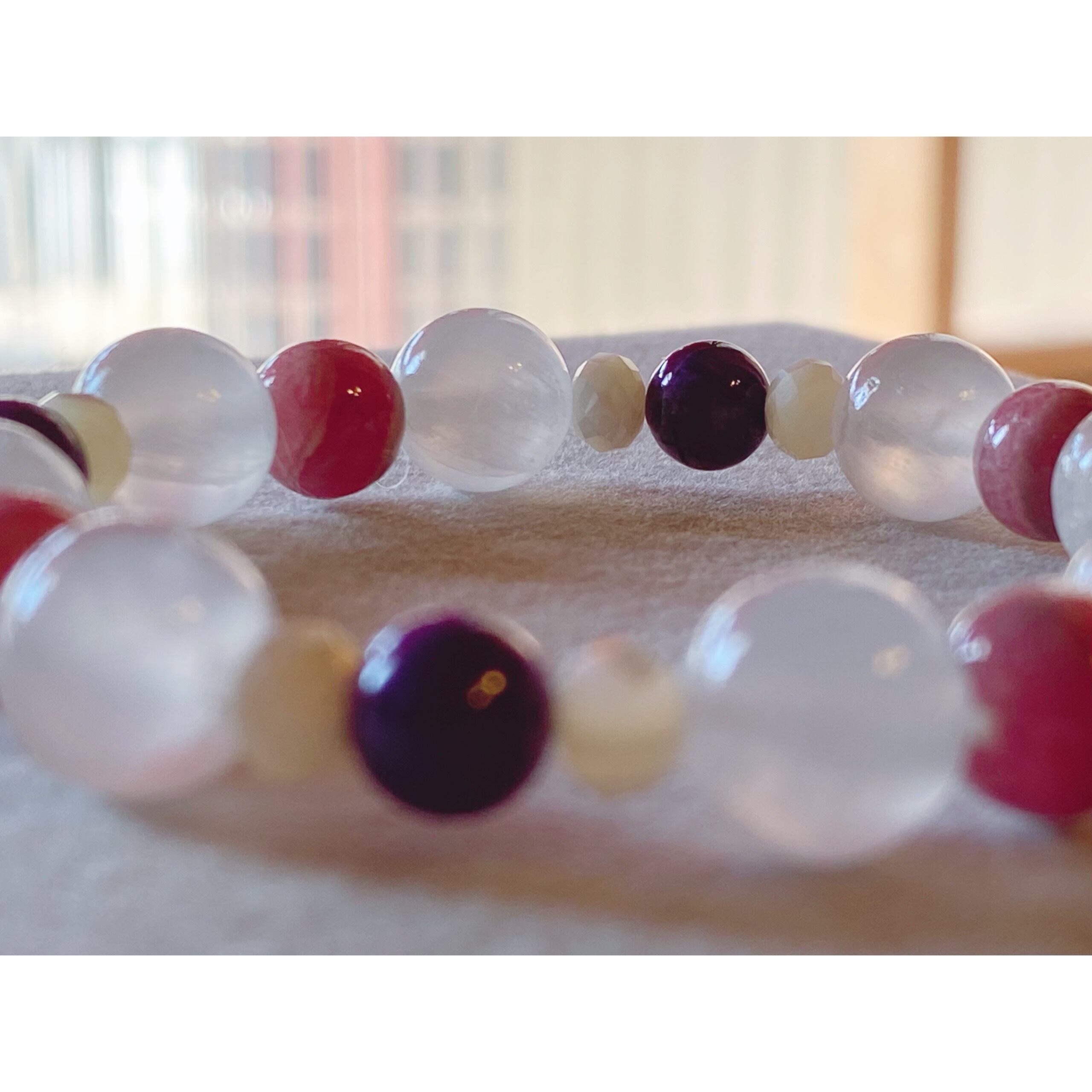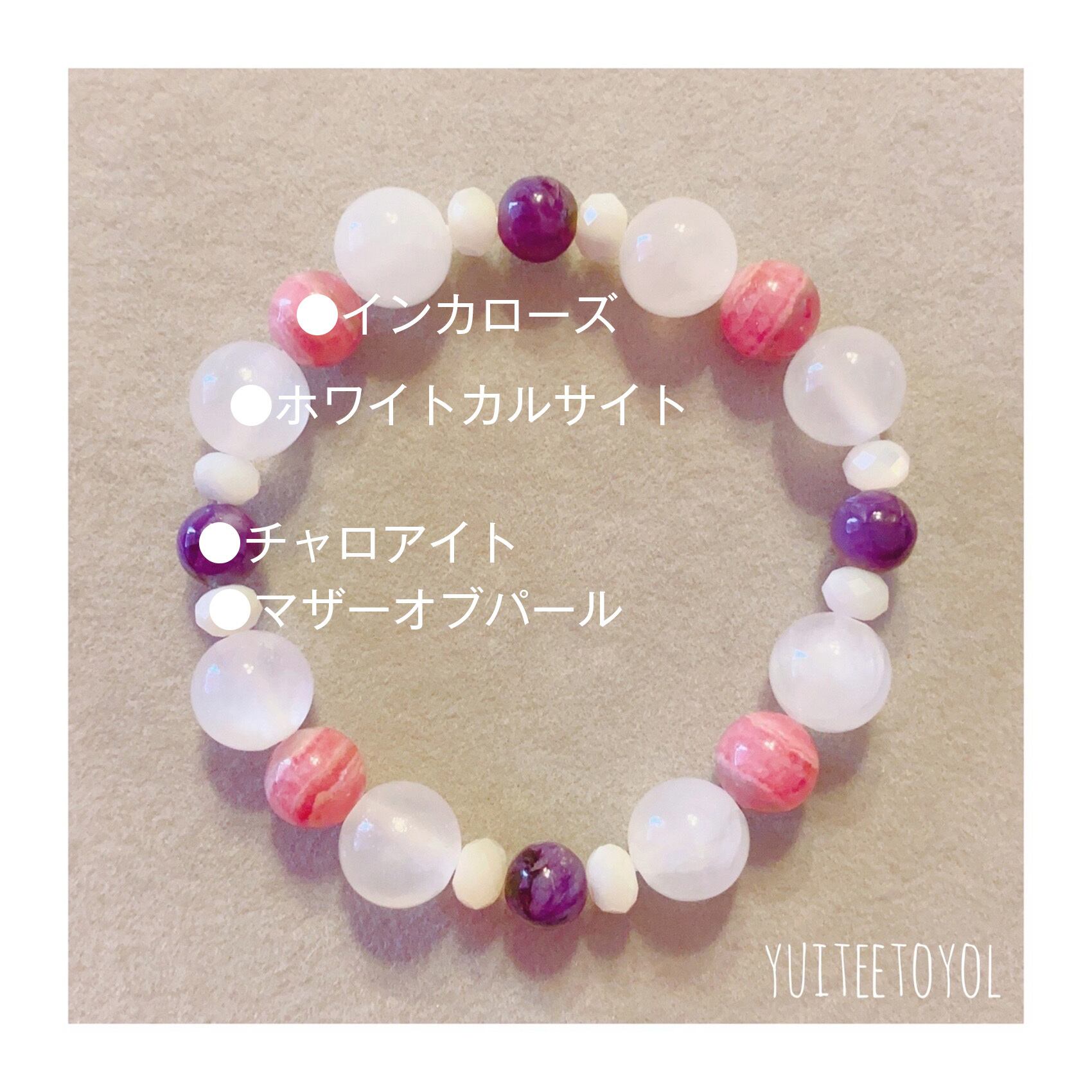 15.5cm【Simplicity of Love】6月誕生石・マザーオブパール・7月誕生石・インカローズ・チャロアイト・ホワイトカルサイト・天然石・パワーストーン・アクセサリー・ブレスレット・曼荼羅・浄化済み