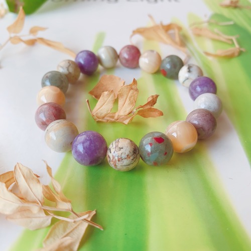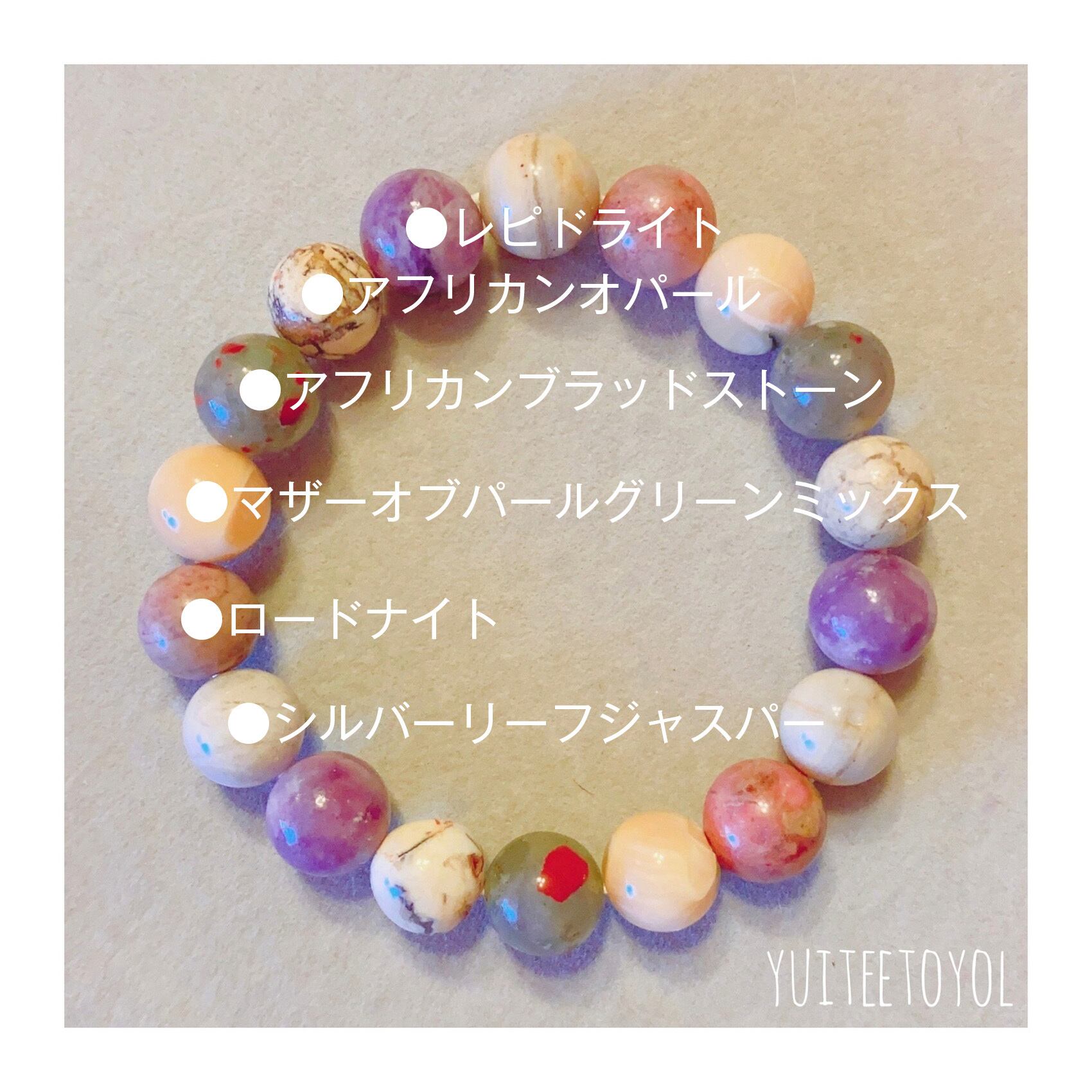 16cm【マイルド】3月誕生石・6月誕生石・10月誕生石・ブラッドストーン・マザーオブパール・アフリカンオパール・レピドライト・ロードナイト・シルバーリーフ・天然石・パワーストーン・ヒーリング・ブレスレット・浄化済み