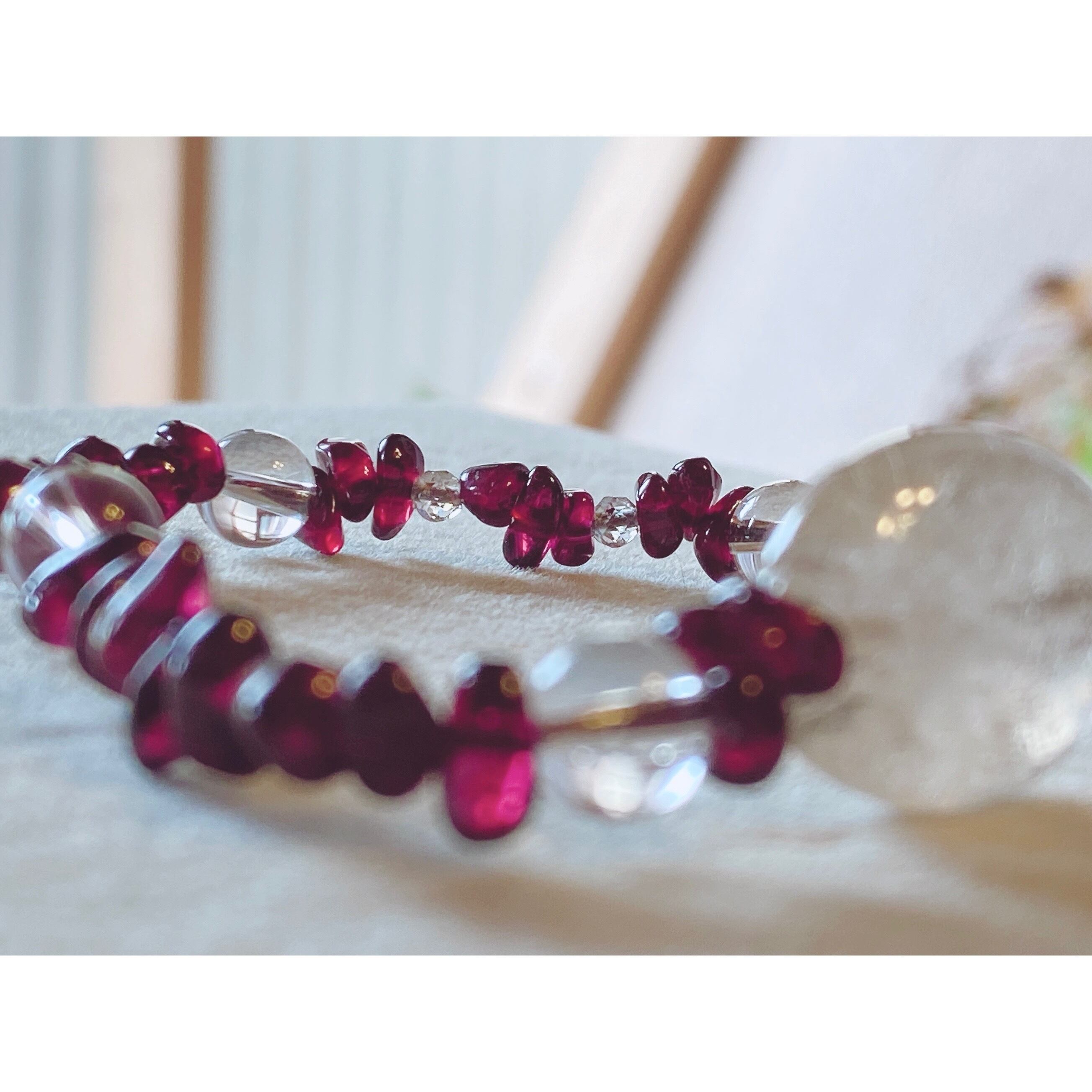15cm【優しい言葉遣い】長さ変更可・1月誕生石・4月誕生石・11月誕生石・ガーネット・ルチルクォーツ・水晶・ホワイトトパーズ・天然石・パワーストーン・クリスタル・ヒーリングストーン・ブレスレット・浄化済み