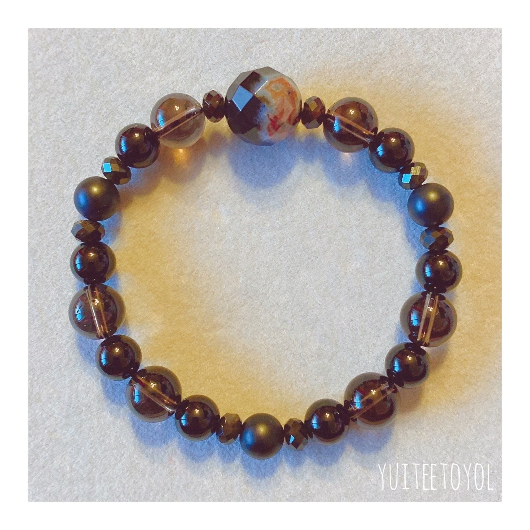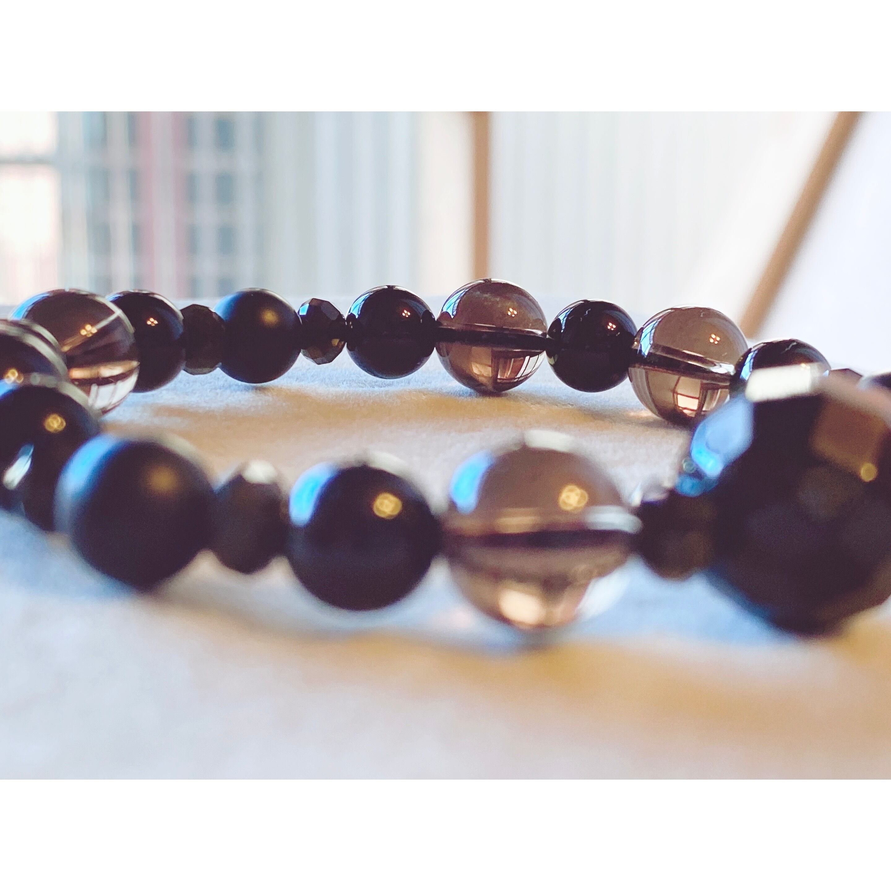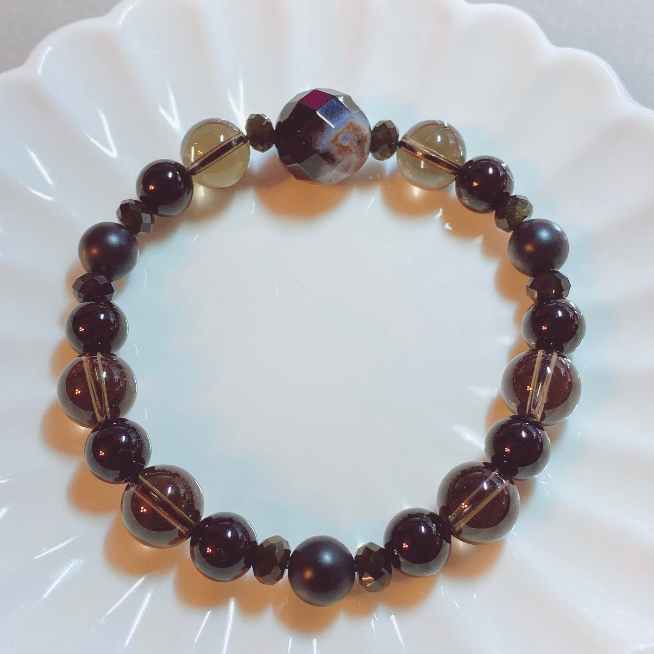 17cm【強力な魔除けⅡ】ストライプオニキス・ゴールデンオブシディアン・チベット産モリオン・フロストオニキス・スモーキークォーツ・天然石・パワーストーン・ヒーリングストーン・ブレスレット・浄化済み