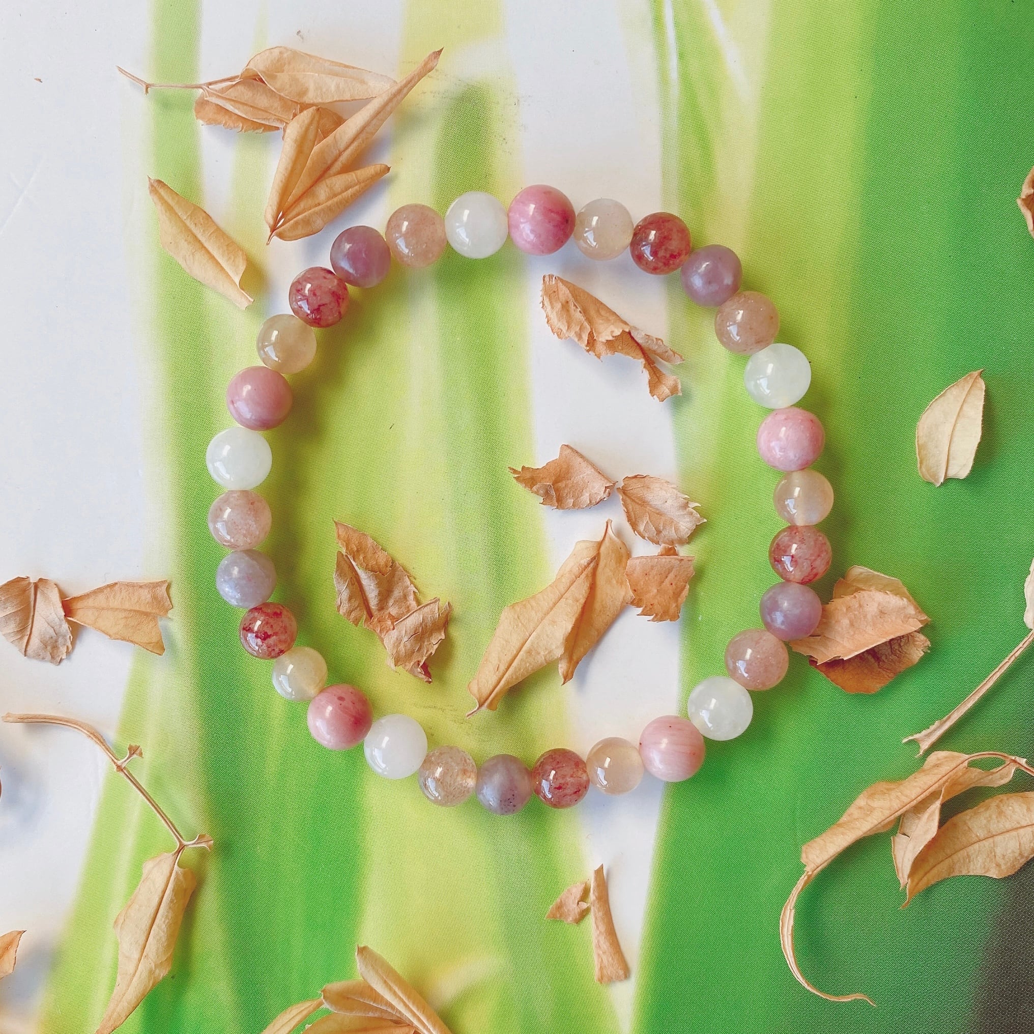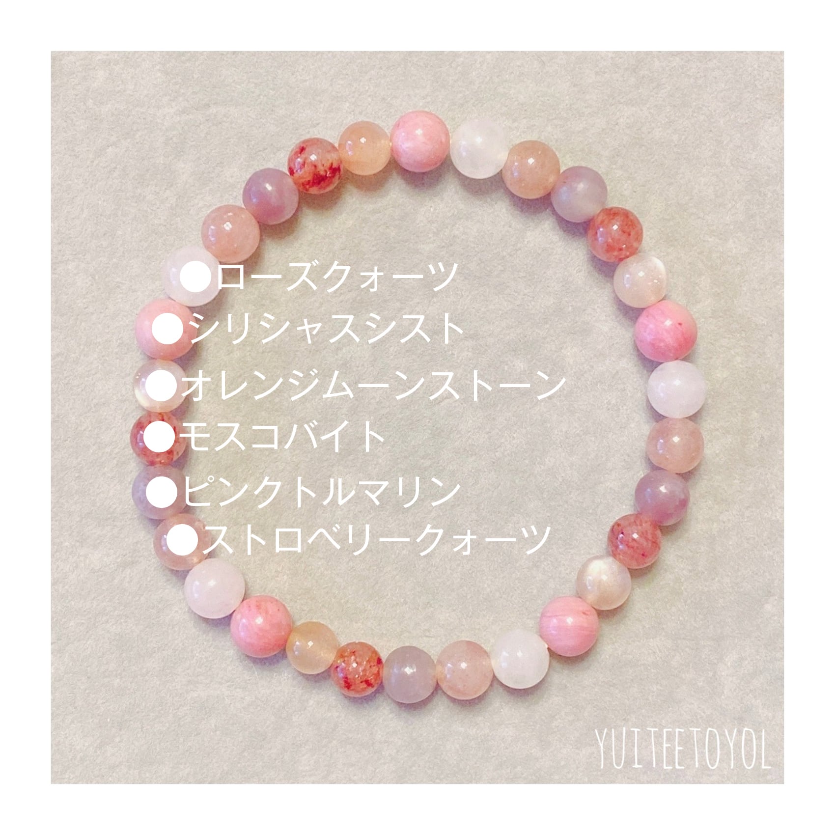 17cm【美と愛の恵み】4月誕生石・6月誕生石・10月誕生石・シリシャスシスト・ローズクォーツ・ストロベリークォーツ・トルマリン・モスコバイト・ムーンストーン・天然石・パワーストーン・ブレスレット・浄化済み