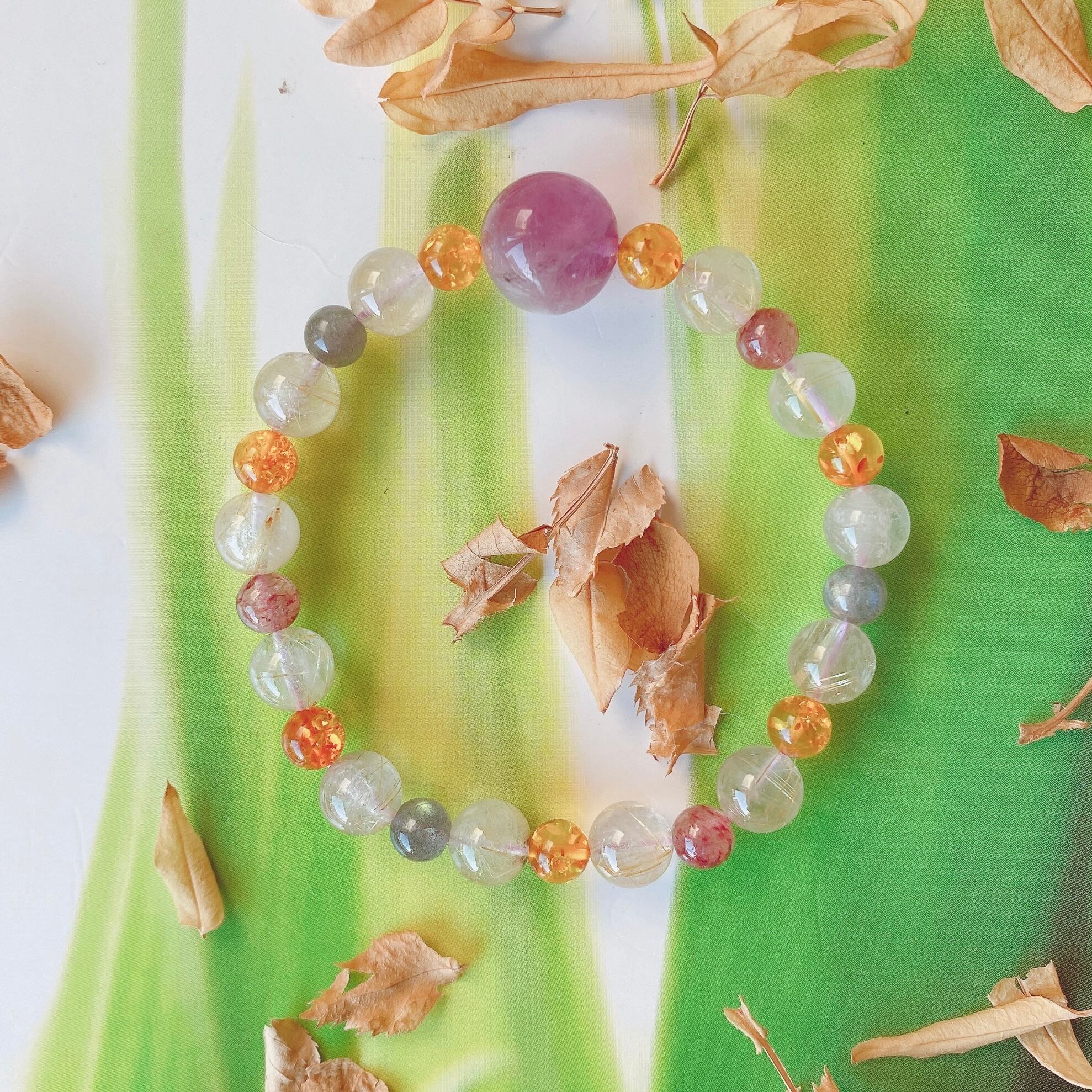 16.5cm【ゴールデンステージ】バルティックアンバー・ゴールデンルチルクォーツ・モスコバイト・ラブラドライト・フェザーインフローライト・天然石・パワーストーン・ヒーリング・ブレスレット・浄化済み