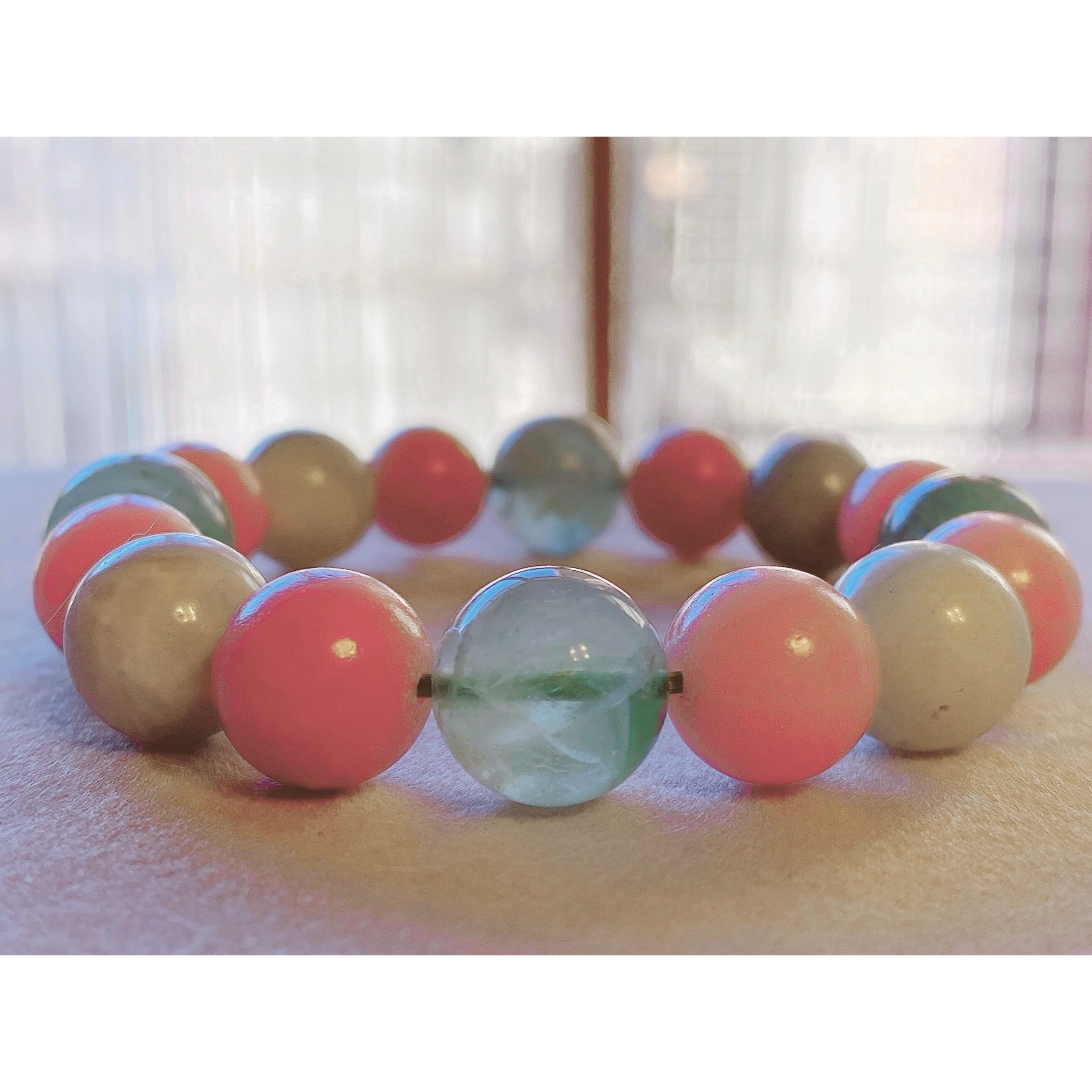 17cm【桃の節句】ピンクタルク・ソープストーン・フェザーインフローライト・ミックスアマゾナイト・天然石・パワーストーン・ヒーリングストーン・ブレスレット・曼荼羅・浄化済み