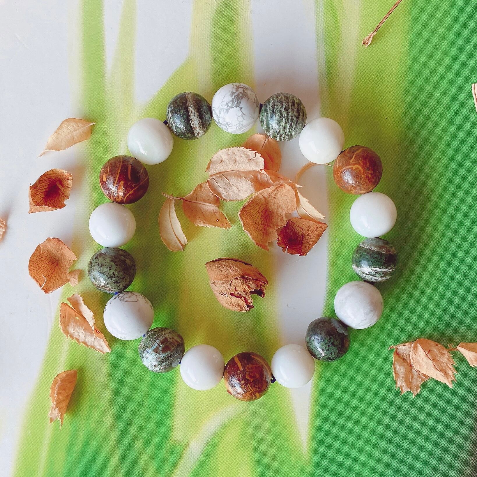 15.5cm【エスニックスタイル】ハウライト・エレファントスキンジャスパー・サーペンティン・ゴールデンシャコガイ・天然石・パワーストーン・ヒーリングストーン・ブレスレット・曼荼羅・浄化済み