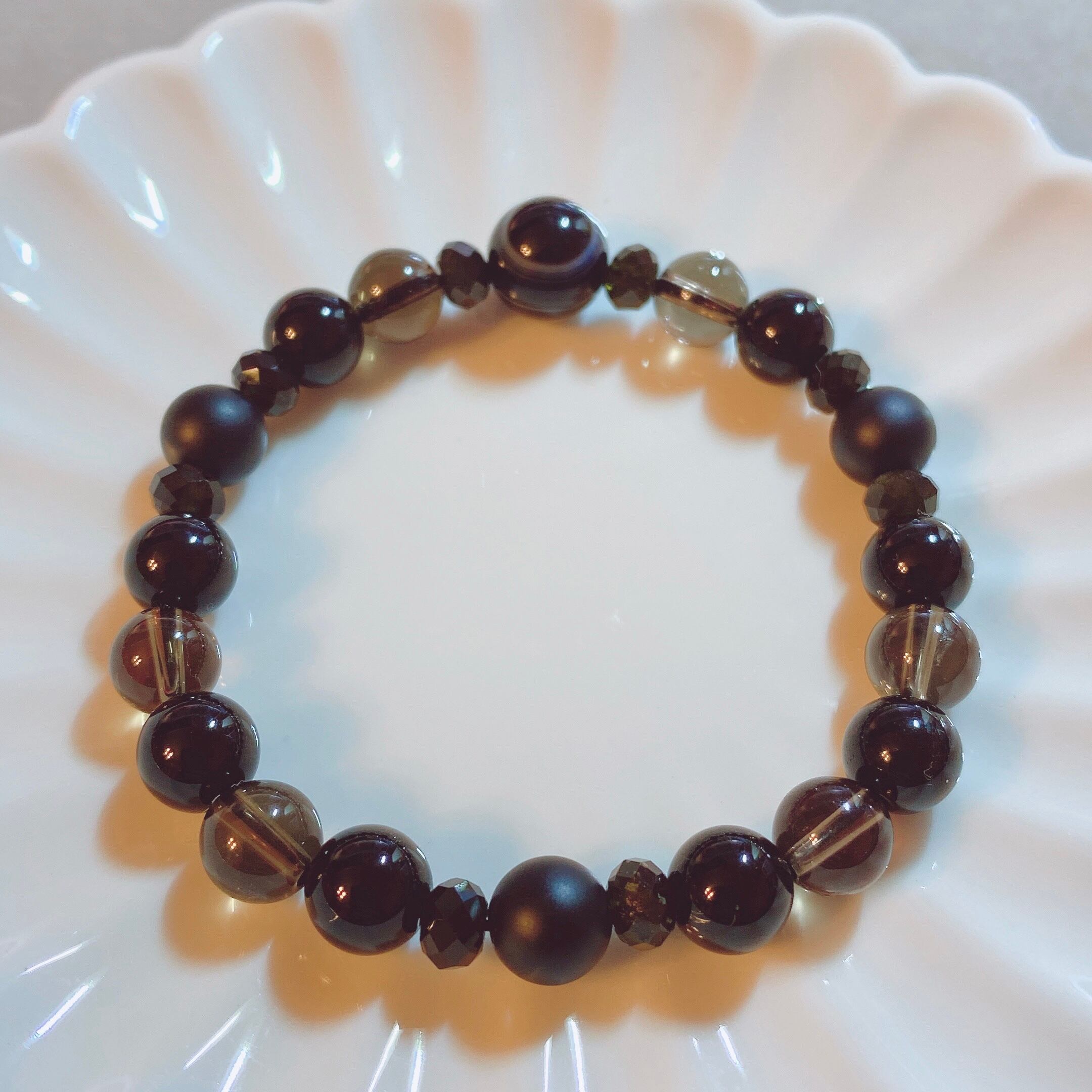 16cm【強力な魔除け】アイアゲート・ゴールデンオブシディアン・チベット産モリオン・フロストオニキス・スモーキークォーツ・天然石・パワーストーン・ヒーリングストーン・ブレスレット・厄除け・浄化済み