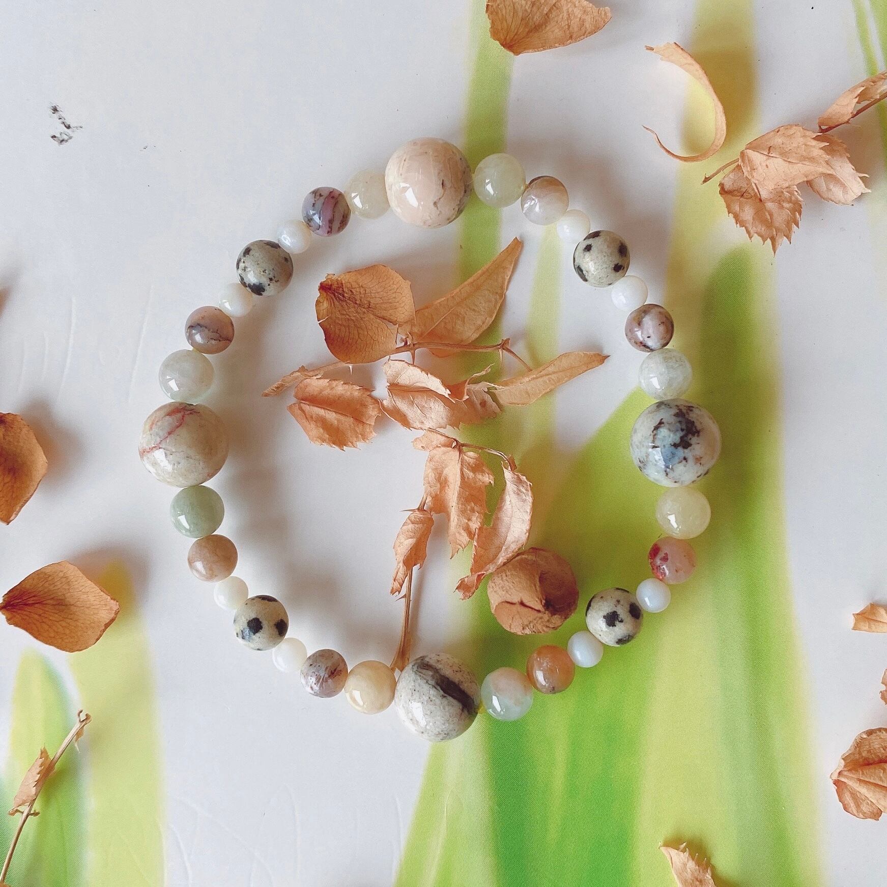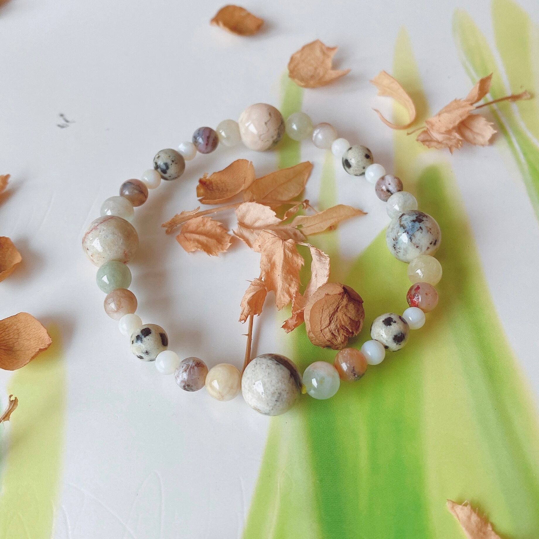 17cm【白蛇が宿る】10月誕生石・アフリカンオパール・ピンクオパール・イエローベリル・マザーオブパール・ダルメシアンジャスパー・天然石・パワーストーン・ヒーリングストーン・ブレスレット・曼荼羅・浄化済み