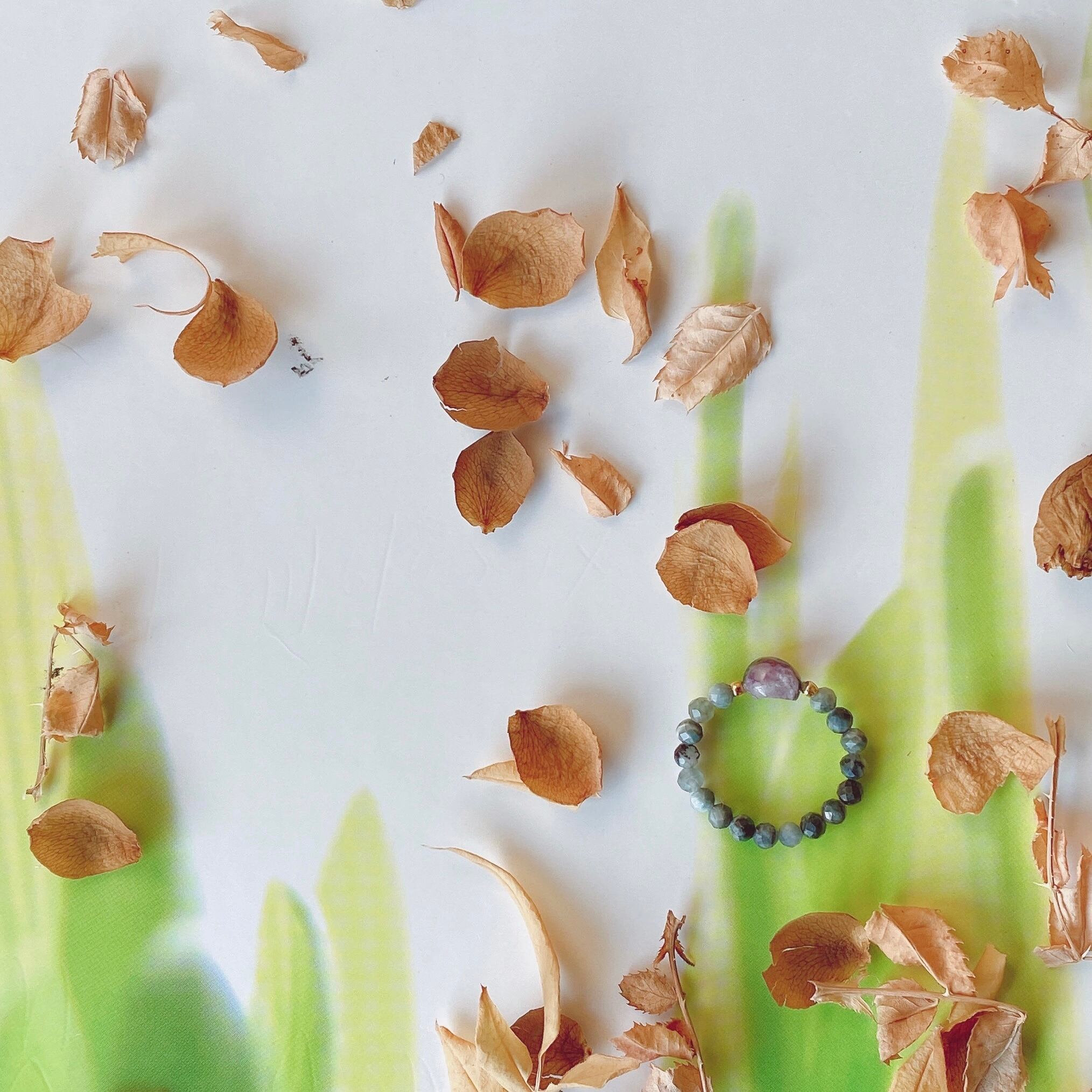 伸び縮みするゴム紐と小粒の天然石を使用しておりますので指にするっと馴染みます。