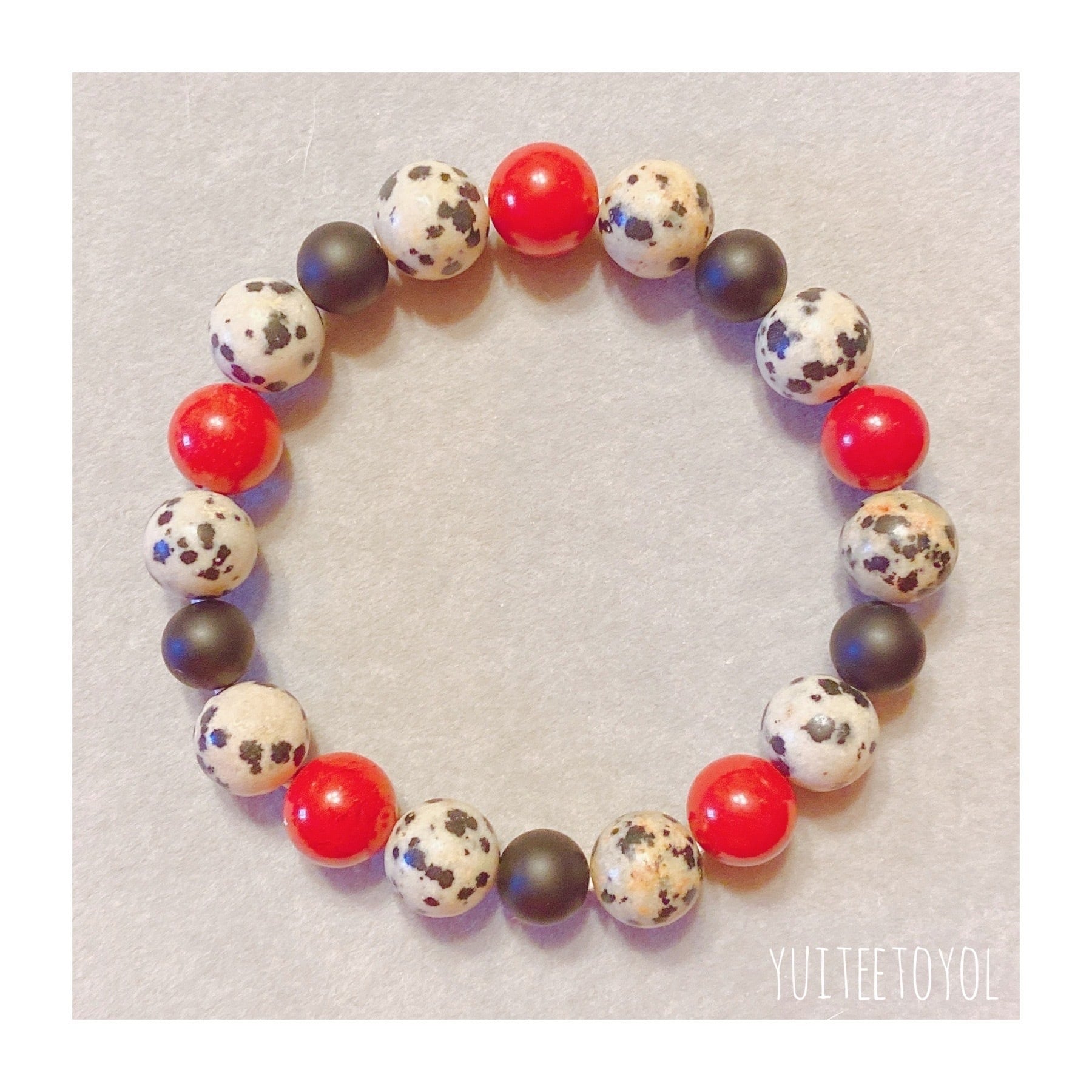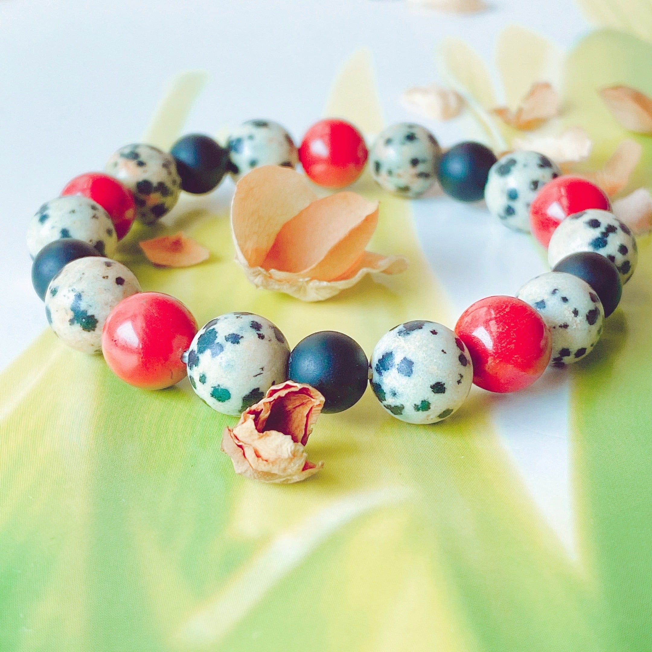 17cm【無邪気な心と決断力】ダルメシアンジャスパー・レッドジャスパー・フロストオニキス・天然石・パワーストーン・ヒーリングストーン・ブレスレット・曼荼羅・浄化済み